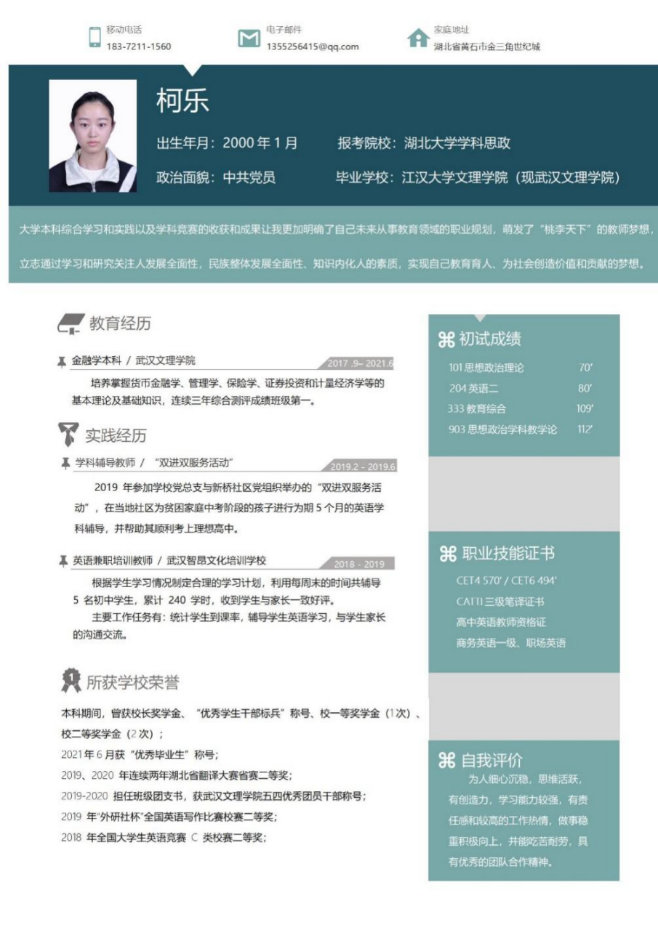柯乐,女,2021届金融实验班毕业生。2022年通过湖北大学马克思主义公司研究生,目前为状态为拟录取中。曾获校优秀毕业生,董事长奖学金、五四优秀团干,校1等奖学金1次、二等奖学金3次、全国老员工英语竞赛二等奖、“外研杯”全国英语写作二等奖;考取全国职场英语证书(一级),高中英语教团队格证书,且以570分和494分一次性通过英语四六级考试。
