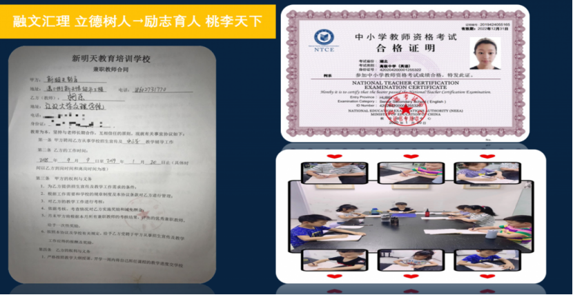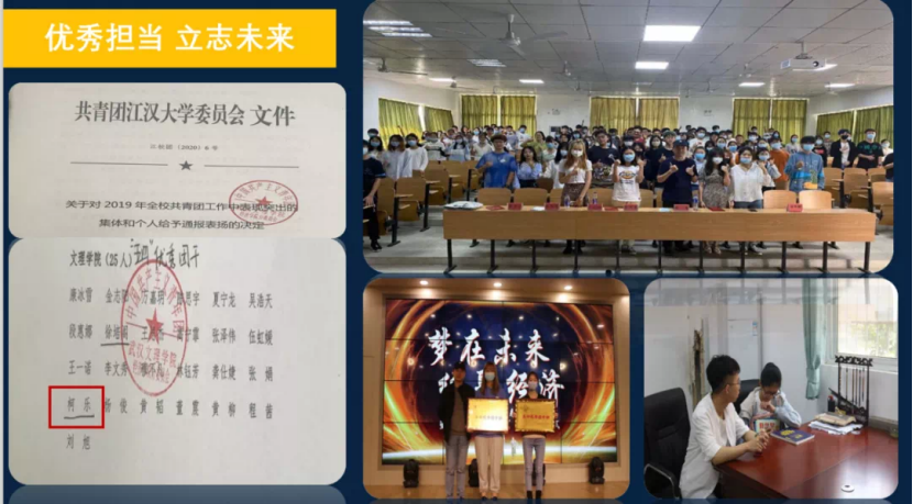 2019年下半年我考获高中英语教资格考试合格证明,同时利用寒暑假在武汉智昂文化培训学习积累实际英语教育学经验。2020年5月,我当选校五四优秀共青团干部,2020年11月我光荣成为一名中共预备党员。