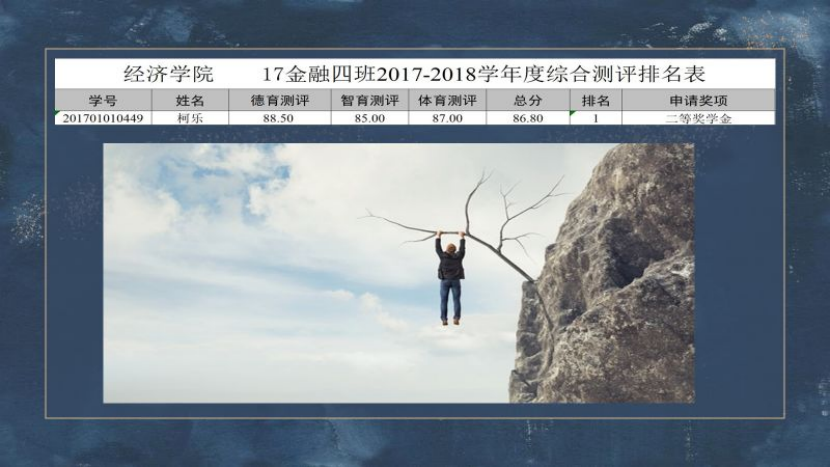 有付出才有会有回报,专业成绩有了起色后,我再也不敢对学习有一丝一毫的松懈,我知道自己刚好在大学里该学习的时候做好了我分内的事情,又恰好在学科竞赛上碰上了我比较擅长的科目,所以让一切看起来是水到渠成。大二下半学年的我曾设想过以后做国贸商务或是进翻译行业,但是我发现因为眼界的原因,现在也仅仅是想一想,不知道从何下手。职场,现在对我来说还是未知,还有着一些迷茫,一些期待。2019年,我进入大三阶段,辅导员张萌老师接手带我们2017级金融4班,他发现我在英语和专业学习方面的成绩后,很快就知道我谈话,他启发我:要做一个全面发展的人,同时不仅仅满足于学习方面的成绩,还要立志做一个对集体、对他人有贡献、有价值的人。