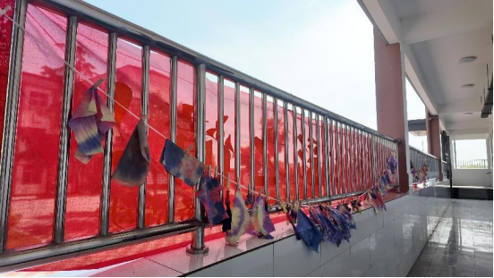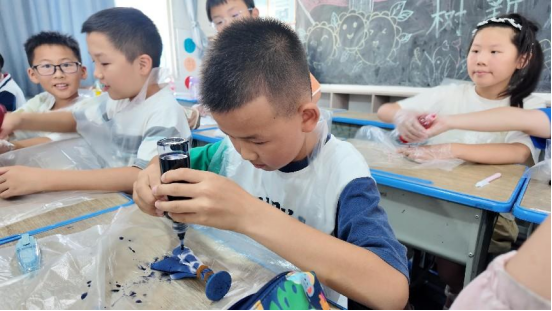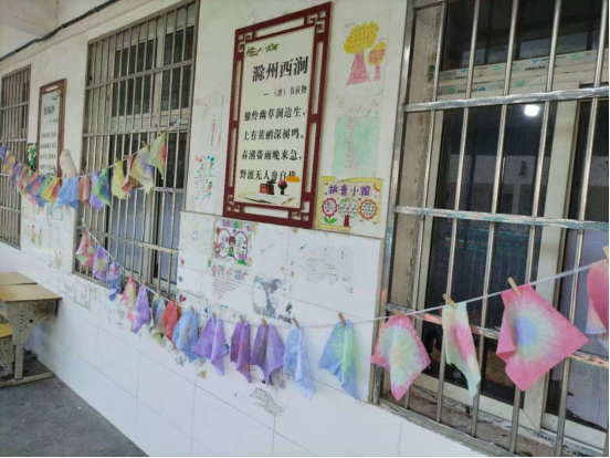 课程结束后,发生了温馨的一幕。为了避免第二天忘记带染好的布料,有一位同学小心翼翼地将自己的作品放在袋子里,并系在了书包上。这一举动虽显稚嫩,但饱含着对自己作品的珍视和对这堂课的喜爱,让在场的志愿者老师们十分感动。带班老师迅速拿出手机,拍下了这一瞬间,同时也记录下了同学们色彩斑斓的扎染作品。