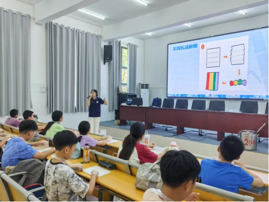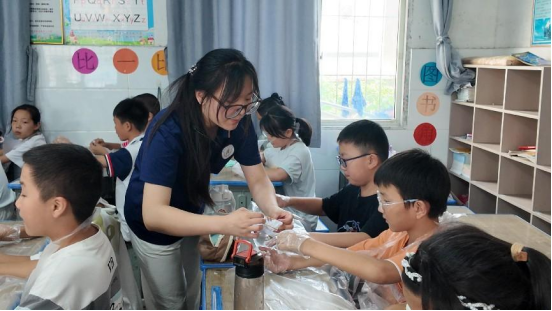 夏韵盈堂传扎艺,清风拂案染非遗。7月7日,在孝感市孝昌县邹岗镇中心小学,赤商追光者志愿服务队的队员们精心准备了扎染教学。活动现场,志愿者老师首先讲解了扎染这一中国民间传统染色工艺的历史渊源、文化内涵和制作方法,从如何折叠布料、用橡皮筋绑扎出不同形状,到浸泡染色的技巧,每一个步骤都耐心示范。员工们听得聚精会神,迫不及待地想要动手尝试。在老师的指导下,大家充分发挥想象力,创作出各具特色的扎染作品。从最初的白色布料,到经过绑扎、染色后呈现出蓝白相间、图案各异的成品,每一块布料都见证了孩子们的创造力和对传统工艺的热爱。