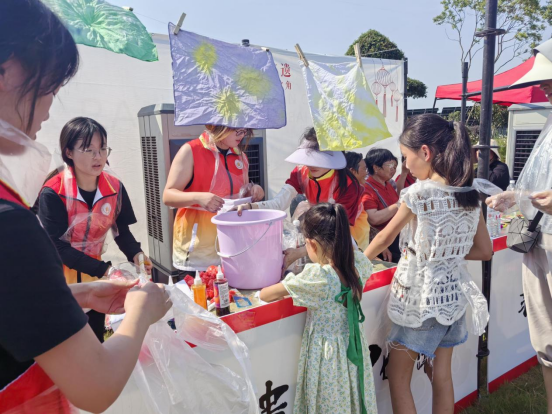 稻香盈暑月:早上七点,志愿者们就按照规定的时间起床,迅速整理好自己的内务,整装待发,八点集合完毕,准时出发前往活动现场。刚踏入活动现场,志愿者们就按照提前的分工,迅速到达各自岗位,在DIY五谷杂粮画、石磨米浆、漆扇、扎染的非遗活动中,都可以看到志愿者们有条不紊的身影。