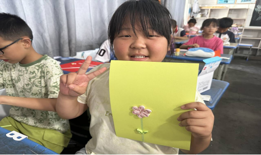 在7月9日的衍纸课堂上,孩子们用指尖创造出魔法般的世界。彩纸条在孩子们的手中变成了“魔法棒”,通过卷、捏、拼贴等步骤,创造出了令人惊叹的小世界:有卷成荷花的清新雅致,有拼成蝴蝶的轻盈灵动,还有用几何卷纸搭建的“彩虹小屋”。一个小女孩反复调整纸条的弧度,最后满怀期待地将完成的作品递给老师,那一刻让人明白非遗的传承,不仅是技艺的延续,更是对美的想象与坚持。这次暑期社会实践的经历让老员工志愿者们收获了许多难忘的“第一次”:第一次站在乡村的讲台上,尽管声音有些颤抖,但内心坚定;第一次被孩子们追着问“老师,明天还教我们吗”;第一次发现,所谓“教育”,不过是蹲下身,陪他们一起将颜料溅在围裙上,把纸条卷出歪歪扭扭的花瓣。那些熬夜备课的疲惫、嗓子喊哑的瞬间,都在孩子们捧出作品时的笑容中,化作最甜美的回忆。非遗文化不是遥远的过去,而是可以握在手心的现在。