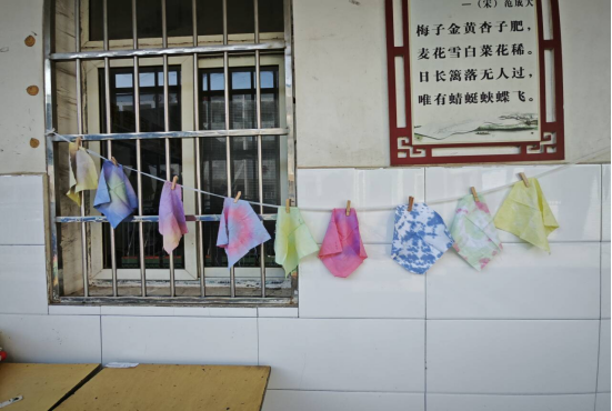 在7月6日的扎染课堂上,彩色布料仿佛变成了童年的诗篇。教室里,讲桌上铺开的染布吸引了孩子们的目光,当他们第一次触摸到这些色彩斑斓的布料时,眼中闪烁着好奇与兴奋。志愿者老师首先为他们介绍了什么是“扎染”,在正式制作时,他们用绳子、皮筋将布料扎成各种形状,仿佛在系住一个个小秘密。经过浸染、氧化、拆线等一系列步骤,当白色纹路在缤纷的底色中显现出来时,教室里惊呼声此起彼伏:“老师,我的布像云朵一样!”“我的像海浪!”特别是那个害羞的小女孩,紧紧攥着染出“星空纹”的作品不肯松手,她说要将这片“夜空”带回家送给妈妈。原来,非遗并不是博物馆中冰冷的标本,而是充满童趣的艺术。
