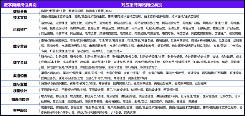 (2)行业热门岗位:数字经济的快速发展,数字商务行业展现出巨大的活力和潜力,短期受全球经济环境影响,出现就业市场紧缩趋势,长期来看,政策支持与新技术发展双重加持或将迎来新增长;