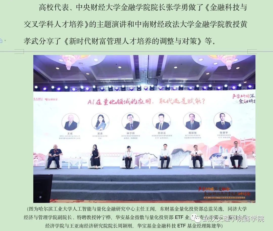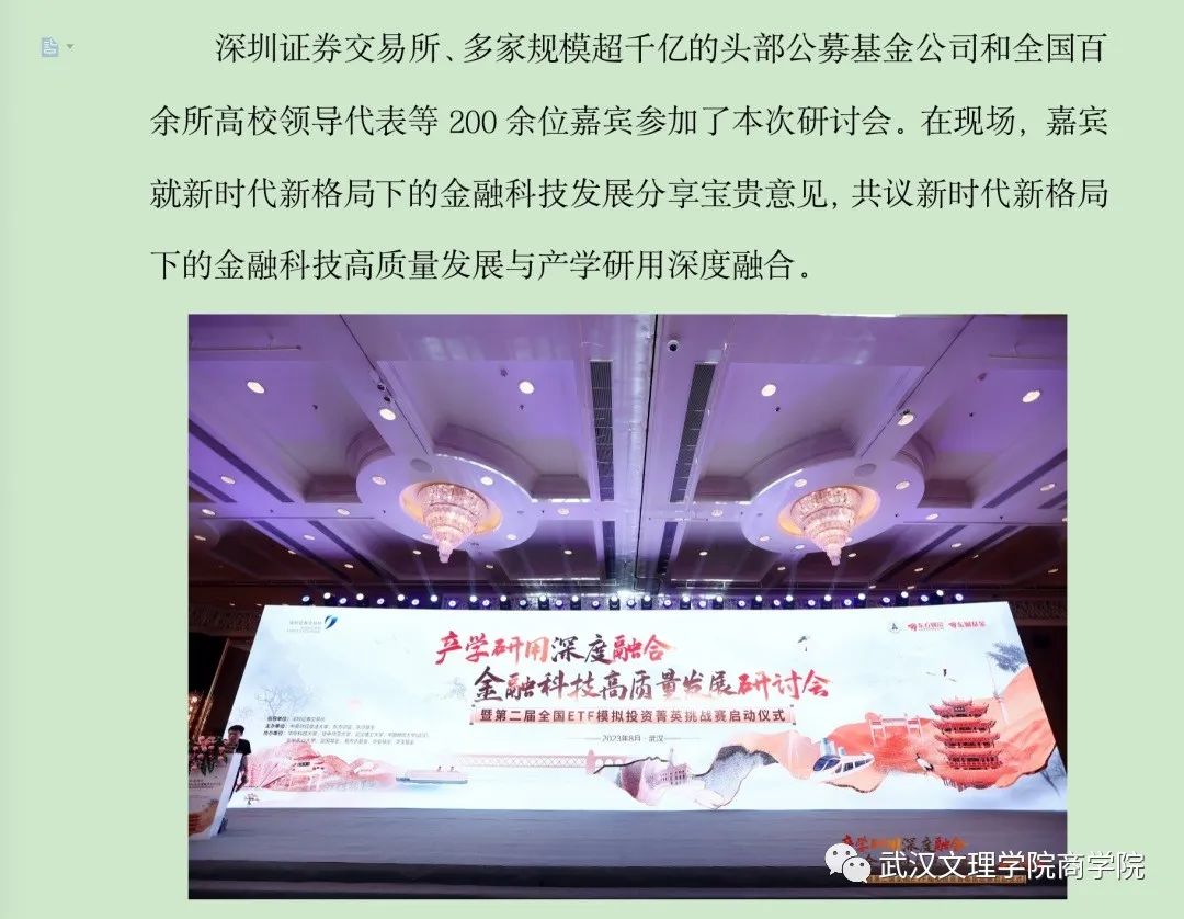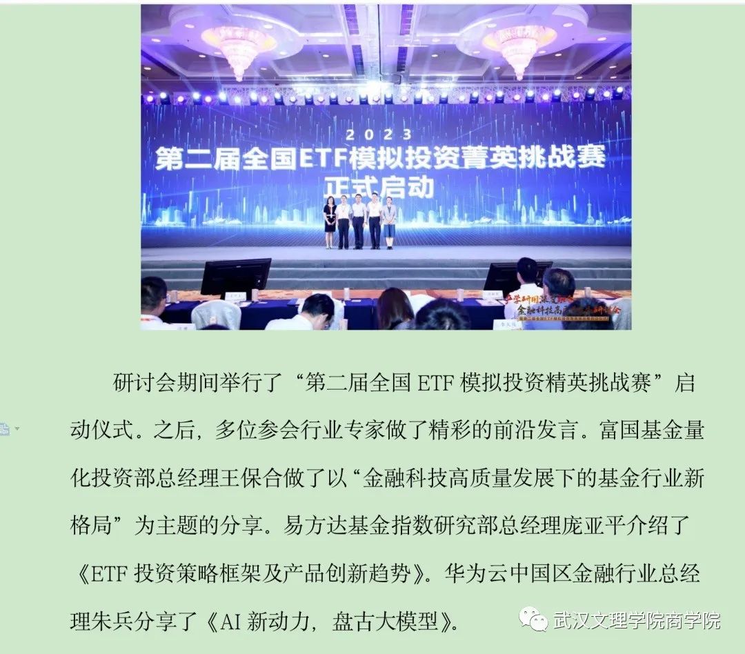 8月11日,为了解业界新技术和企业用人新需求,切实推进校企合作,加大产教融合步伐,优化应用型人才培养体系,拓展PA视讯实习实践基地,PA视讯教学副经理刘炫、投资系主任刘圣龙、副教授汪笛晚在武汉应邀参加了由深圳证券交易所指导,中南财经政法大学、东方财富、东财基金联合主办的“产学研用深度融合 金融科技高质量发展”研讨会暨2023年第二届全国ETF模拟投资菁英挑战赛启动仪式。