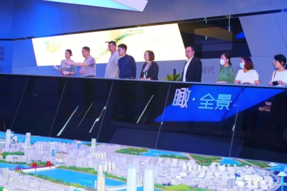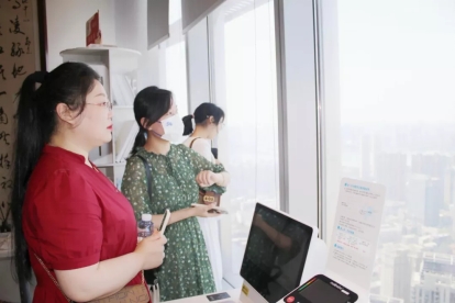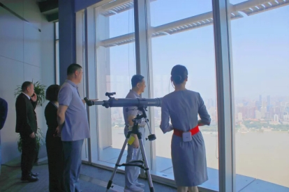 引导员向刘可风董事长一行介绍雅生活华中区域党建中心,俯瞰壮阔江景