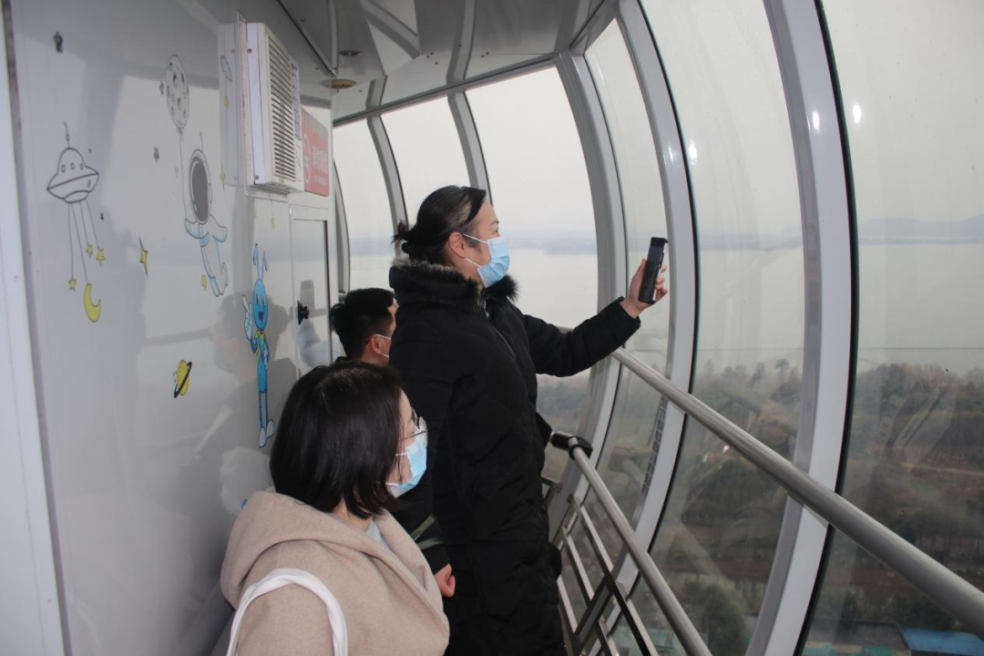 随后,师生一行在吴茜经理、熊娜主管的带领下坐游览车参观园区并体验了武汉欢乐谷彩绘墙、东湖塔、《飞跃长江》影院、情景剧表演等旅游产品项目。