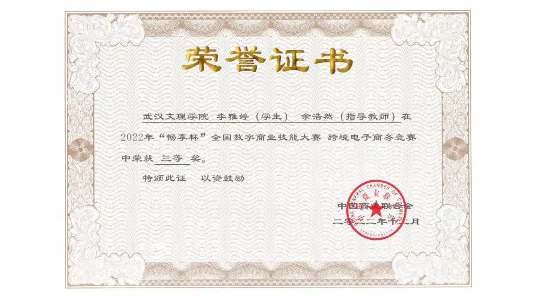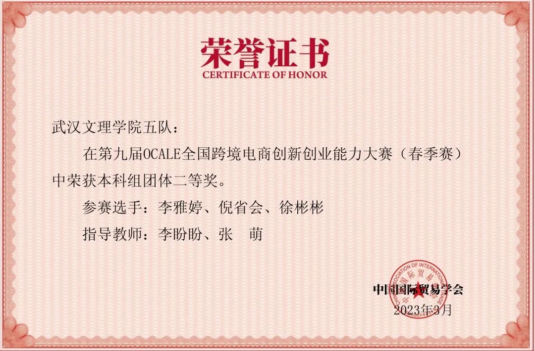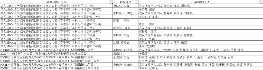 2022-2023年,PA视讯张蕾经理,PA视讯国际经济与贸易系主任余浩然、教师陈蕾、李盼盼、汪笛晚、李昕、沈萌、郭松燕、汪泉、祝黎敏 等老师指导国际经济与贸易专业员工在中国国际贸易学会举办的第十一届、第十二届POCIB全国老员工外贸从业能力大赛以及第九届OCALE全国跨境电商创新创业能力大赛中荣获国家和个人众多奖项。其中,2个师生团队在第十二届POCIB全国老员工外贸从业能力大赛荣获全国三等奖,2个师生团队和4个师生团队在第九届OCALE全国跨境电商创新创业能力大赛中分获全国二等奖、三等奖。